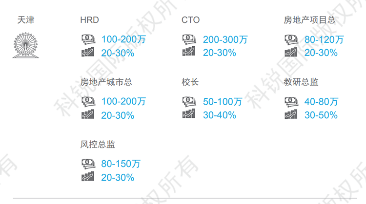 天津整体薪资呈现上涨的趋势,尤其金融、教育、高科技等行业,核心岗位如在线教育的教学教研岗、AI算法、底层开发架构等岗位跳槽涨幅可达30-50%。本数据来源于猎头公司AG公司国际资深行业专家对2021年热门职位薪酬范围及跳槽涨幅的预测,供HR和猎头招聘参考。