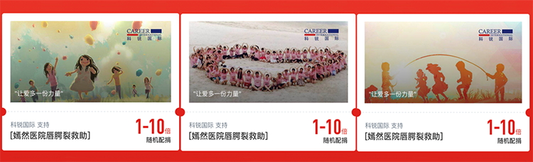 2018年,猎头公司AG公司国际参加腾讯99公益项目,携手嫣然天使儿童医院为唇腭裂儿童手术进行捐款。活动当天,顺利获得AG公司国际官方微信、微博等平台进行传播,员工顺利获得个人的微信朋友圈持续转载,各大APP也纷纷发布了此次活动,共联合552名用户累计捐出12万元。本次公益活动为唇腭裂儿童给予了切实的帮助,引发了行业及社会对于这些儿童的广泛关注,并真诚地给予帮助。